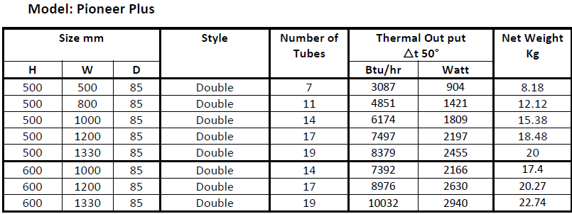 | Model: Pioneer Plus | W:500 , H:1000 , D:85 / Tube: 7, W:500 , H:800 , D:85 / Tube: 11, W:500 , H:1000 , D:85 / Tube: 14, W:500 , H:1200 , D:85 / Tube: 17, W:500 , H:1330 , D:85 / Tube: 19, W:600 , H:1000 , D:85 / Tube: 14, W:600 , H:1200 , D:85 / Tube: 17, W:600 , H:1330 , D:85 / Tube: 19 |