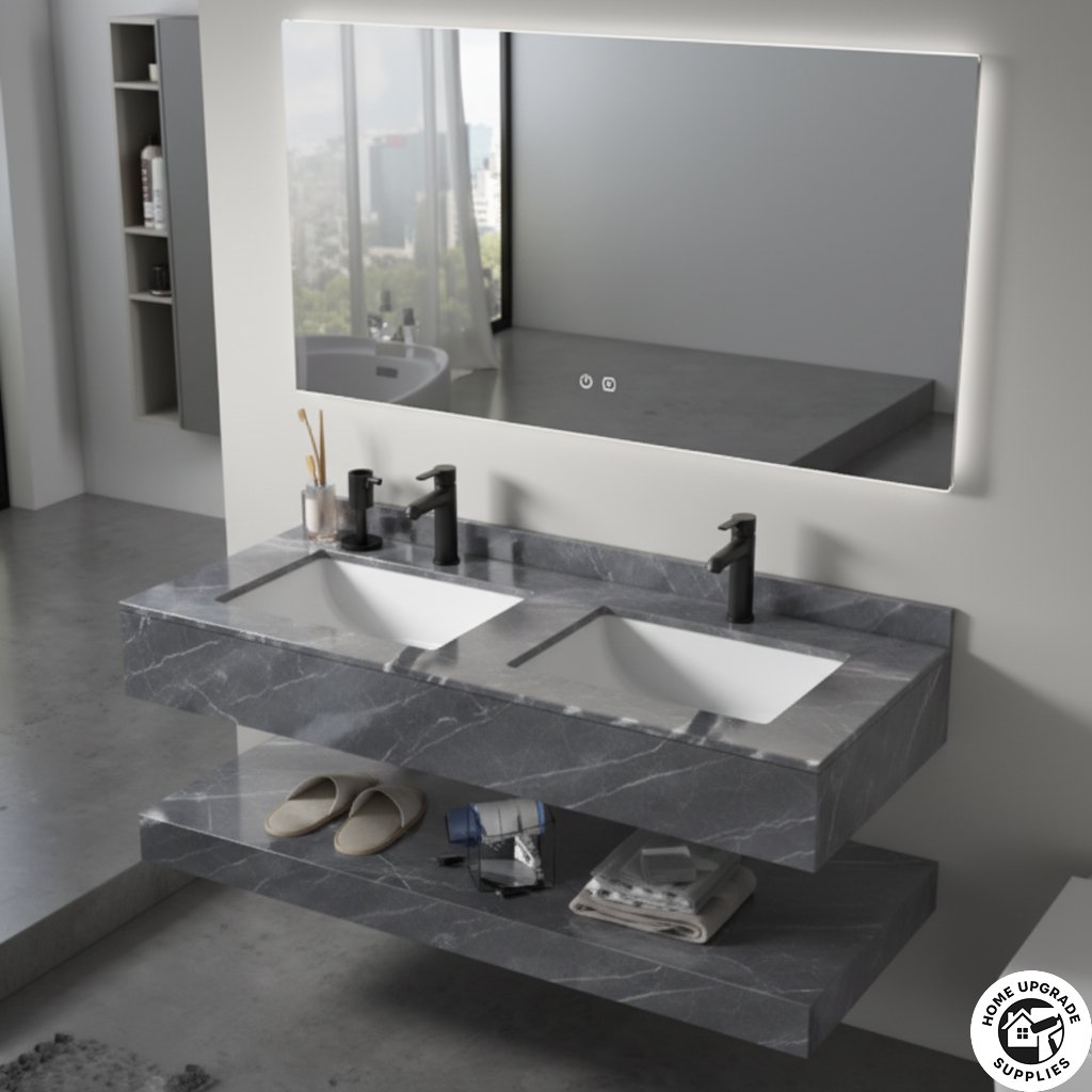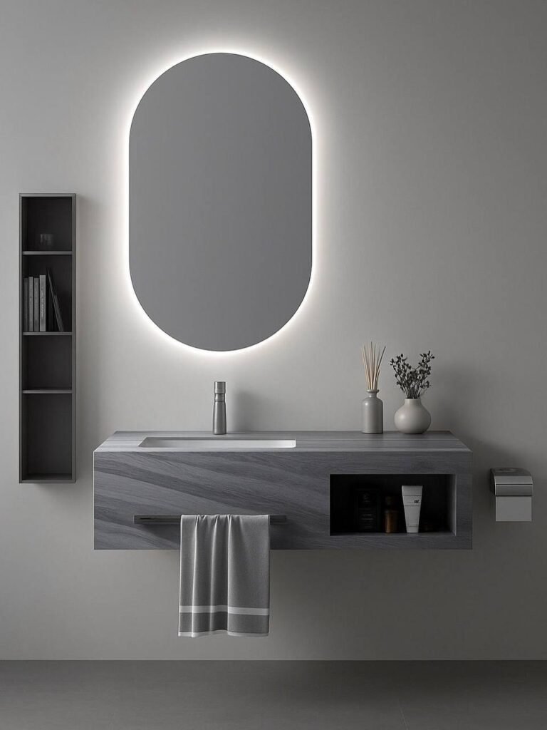 The curved edges of its smart mirror create a smooth visual rhythm, softening the modern lines of the vanity. The result is a timeless piece that feels both architectural and serene elegant simplicity at its finest.