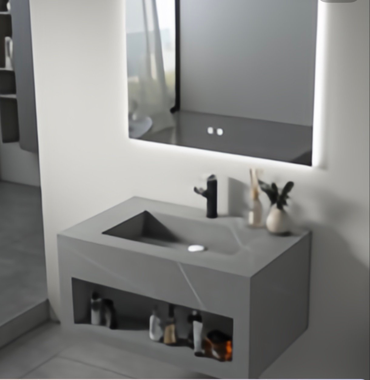 The one-person Unique Vanity with smart mirror features intelligent lighting,